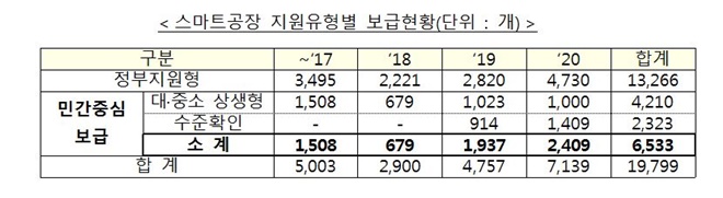 스마트공장 7139개 중 대·중소 상생형과 스마트공장 수준 확인 등 민간 중심의 보급이 2409개로 19년(1937개)에 비해 증가한 것으로 나타났다.