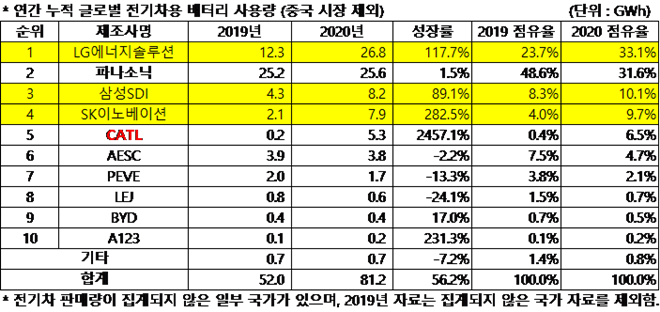 SNE리서치가 17일 발표한 자료에 따르면 2020년 연간 판매된 중국 시장을 제외한 글로벌 전기차에 탑재된 배터리 사용량 순위에서 한국의 LG에너지솔루션이 1위로 올라섰다. 삼성SDI와 SK이노베이션도 각각 3위와 4위를 지켰다.