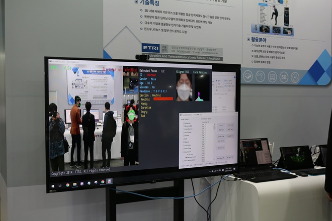 ETRI가 선보인 마지막 기술은 인공지능 얼굴정보 인식 기술이다. 이 기술은 사람의 얼굴에서 나타나는 정보를 통합적으로 인식해 로봇이 사회적 상호작용 단서를 이해하고 적절히 반응함으로써 사람과 로봇 간의 자연스러운 상호작용을 가능하게 하는 기술이다. 특히 이 기술에서 인식하는 사람의 얼굴 정보는 얼굴, 성별, 연령, 시선 등을 넘어서 표정, 감정, 거리, 자세 등 더욱 자세하고 면밀한 사람의 얼굴정보를 추출해 인식한다.