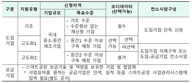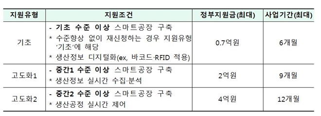 기업의 스마트공장 구축 수준에 따라 스마트공장 구축 및 고도화(▲기초·고도화1·고도화2 ▲대중소 상생형)을 신청하면 된다.