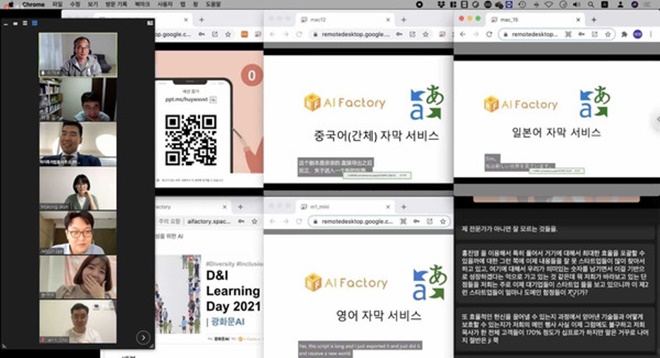 ▲실시간 자막 서비스가 진행되고 있는 모습. 왼쪽으로 7명의 연사들이 참여하고 있는 모습이 보이고 있다(출처 : 인공지능팩토리)