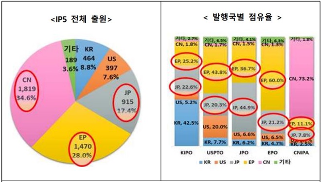 출원인 국적별로 살펴보면 중국이 1819건(34.6%)으로 가장 많고, 유럽 1470건(28.0%), 일본 915건(17.4%), 한국 464건(8.8%), 미국 397건(7.6%) 순으로 나타났다.
