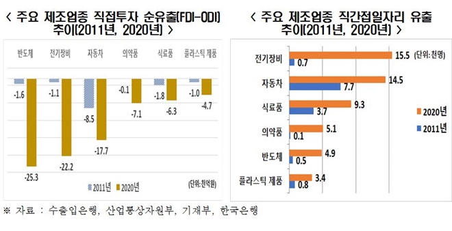 해외직접투자 급증, 외국인투자 유입 감소로 인해 2020년 기준 직접투자 순유출액은 ▲반도체(2조5천억 원) ▲전기장비(2조2천억 원) ▲자동차(1조8천억 원) 등에 달했다. 지난해 직간접 일자리 유출 규모는 ▲전기장비(15.5천 명) ▲자동차(14.5천 명) ▲식료품(9.3천 명) ▲의약품(5.1천 명) ▲반도체(4.9천 명) 순이었고, 2011년에 비해 약 1.9~37.6배 높았다.