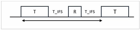 ‘T’는 송신 패킷(Transmission packet), ‘R’은 상대 장치로부터 패킷 수신을 확인하는 응답 패킷(Receive packet), ‘T_IFS’는 두 연속 패킷 간의 시간 간격(Inter Frame Space)이다.