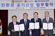 [첨단 헬로티] ▲ 왼쪽부터 김성진 광주테크노파크 원장, 성윤모 산업통상자원부 장관, 이용섭 광주광역시장, 송대현 LG전자 H&A사업본부장(사장) 광주지역의 공기질 개선과 일자리 창출 등 환경과 경제가 함께 개선될 것으로 보인다. 18일, LG전자·광주광역시·광주테크노파크가 광주광역시 북구 대촌동에 있는 광주테크노파크에서 협약을 맺고 공기산업 연구개발, 생산·제조 분야 협력적 생태계 조성, 일자리 창출 등 협력키로 했다. 이번 협약식에는 성윤모 산업통상자원부 장관, 이용섭 광주광역시장, LG전자 H&A사업본부장 송대현 사장 등이 참석했다. 이번 협약을 통해 공기산업 관련 공동 연구개발, 생산·제조 분야 협력적 생태계 조성, 일자리 창출 등을 중심으로 사업이 진행된다. LG전자 등 협약 참여기관 3곳은 주거 공간부터 학교, 병원 등과 같은 대형 공간까지 다양한 공간의 공기질을 개선하기 위한 실증연구를 공동으로 진행한다. 또 센서, 필터 등에 대한 연구를 진행해 공간별로 특화된 공기청정제품을 개발하기로 했다. 또 참여기관은 광주광역시의 공기산업 관련 기업들이 사업화를 진행할 때 필요한 기술을 지원한