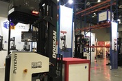 [첨단 헬로티] 4차산업혁명의 최신기술이 반영된 물류산업의 미래를 가늠할 '국제물류산업대전 2019(KOREA MAT 2019)'가 지난 16일 일산 킨텍스에서 개최됐다. 두산 로지피아는 이번 물류산업대전에서 자사의 지게차와 무인지게차, 파워팔레트 트럭, 두산의 TMS인 'Lin-Q'서비스를 선보였다. 제1전시장 1홀 뒤편, 넓은 부스를 차지한 두산 로지피아는 전시회를 찾은 참관객에게 다양한 볼거리를 제공했다. 참관객의 시선을 가장 먼저 사로잡은 장비는 무인지게차 'AGV'의 시연이었다. AGV는 사람의 도움 없이 스스로 물류작업을 수행함으로써 근로환경 변화에 유연하고 효율적으로 대응할 수 있는 장비다. ▲두산 로지피아의 무인지게차 'AGV' 무인지게차 옆에는 전동 좌승식 지게차 모델 'B25S-7', 'B50X-7'이 전시됐다. 두 모델은 다년간 시장에서 검증된 Curtis AC 컨트롤러와 고강도 드라이브 액슬의 조합으로 강력한 토크와 높은 내구성을 보증하는 지게차다. 씰링 처리된 습식 디스크 브레이크는 반영구적인 수명을 자랑한다. 이외에도 전·후진 스위치를 작업기 레버에 장착해 작업기에서 손 뗄 필요없이 빠르게 작업할 수 있기에 운전자의 피로