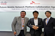 SK텔레콤은 최근 글로벌 통신 장비 업체인 시스코, 유무선 통신 솔루션 업체인 엔텔스와 ‘지능형 네트워크 플랫폼’ 개발을 위한 상호 양해 각서(MOU)를 체결했다. SK텔레콤의 을지로 사옥에서 열린 체결식에는 박진효 네트워크 기술원장과 시스코의 스캇 야우 모바일 가상화 솔루션 제품 총괄 부사장, 심재희 엔텔스 대표 등 3사의 주요 관계자들이 참석해 MOU가 실질적 결실로 이어질 수 있도록 적극 협력을 다짐했다. 이번 MoU의 핵심인 ‘지능형 네트워크 플랫폼’은 고객들의 네트워크 사용 패턴 등에 따라 필요한 때, 필요한 곳에 가상화된 네트워크 기능들을 설치하고 연결하는 미래형 네트워크 구조를 의미한다. ‘지능형 네트워크 플랫폼’이 상용화되면 사물인터넷(IoT), 공공안전망, 미디어 스트리밍 등 용도에 따라 특화된 네트워크를 신속하게 구축하는 것이 가능하다. 또한, 스마트 기기를 통해 발생하는 다양한 트래픽을 고객이나 서비스, 단말 유형별로 나눈 맞춤형 네트워크 서비스를 제공할 수 있다. 3사는 플랫폼의 개발을 위해 네트워크 기능 가상화(Network Function Virtualization, 이