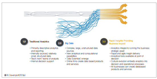 빅데이터 분석 이론가인 데이븐포트(Davenport)는 빅데이터 분석 진화과정을 1.0, 2.0 외에 3.0으로 구분하여 설명하면서 구글과 야후, 이베이, 아마존 등은 이미 데이터 및 분석 기반으로 고객을 위한 신규 서비스를 창출하고 있다고 언급했다.