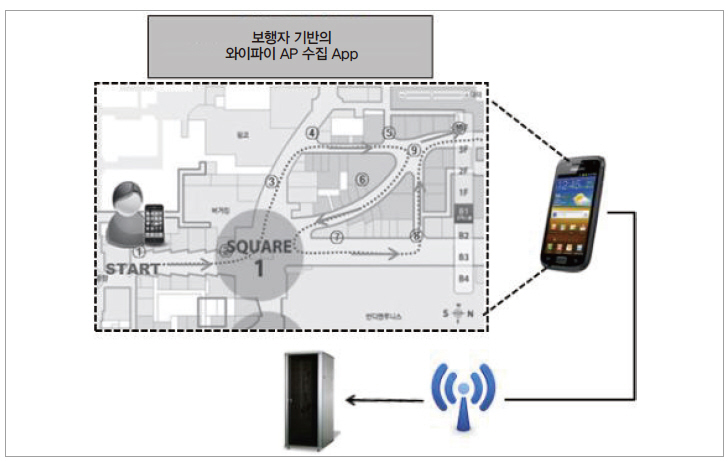 그림 2는 보행자용 인프라 측정 정보 자동 수집 기술의 개념도이다. 이 기술은 스마트폰을 이용하여 실내지도 상에 수집 경로를 설정하고, 수집을 시작하면 자동으로 수집 위치 및 주변 인프라 측정 정보를 획득한다. 수집 위치는 경로 정보와 보행자 추측항법(Pedestrian Dead Reckoning) 기술을 결합하여 계산하며, 시간이 경과됨에 따라 누적되는 수집 위치 오차는 경로변화 시 센서 이벤트 정보를 인식하여 맵매칭을 통해 제거함으로써, 장시간 동적 수집 시 고정밀도의 수집 위치 정확도를 제공한다.