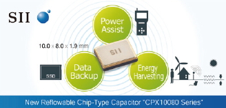 세이코 인스트루먼츠(Seiko Instru-ments Inc., SII, 이하 세이코)가 칩 형태의 전기 이중층 커패시터(EDLC) 라인업을 확대한다고 발표했다. 새로운 제품은 CPX10080C104F(이하 CPX104), CPZ10080C104F(이하 CPZ104) 및 CPX10080C402F(이하 CPX402) 등이다. CPX104는 내부 임피던스가 0.5옴으로 동급 제품 중 가장 낮으며 CPZ104 는 내부 임피던스가 1.5옴이어서 누설 전류가 10nA로 매우 적다.