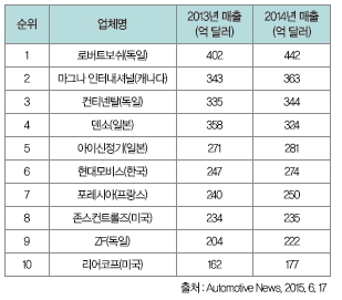 표 1과 같이 세계 자동차 부품 업체들의 매출 순위를 살펴보면, 로보트보쉬가 2014년 매출 442억 달러로 1위, 마그나 인터내셔널이 363억 달러로 2위, 컨티넨탈이 344억 달러로 3위, 덴소가 324억 달러로 4위, 현대모비스는 274억 달러로 6위를 기록하고 있다. 보쉬, 마그나 인터내셔널, 컨티넨탈, 덴소, 아이신정기 등 선진 업체들은 이미 수십년전부터 전장사업부를 설치해 전장 제품들을 자체 개발해 생산하고 있는 반면, 현대모비스는 주요 핵심 부품을 해외업체로부터 수입해 모듈로 제작한 후 현대자동차에 납품하는 구조이므로 자체 기술력은 미흡한 편이다.