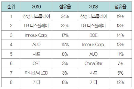 표 1. 2010년과 2018년의 전 세계 FPD 시장 점유율 출처 : IHS