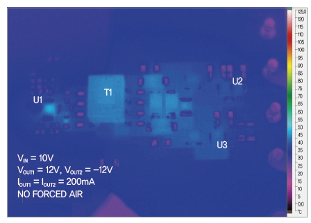 그림 3∼5의 측정 결과를 보면, 그림 1의 푸쉬-풀 컨버터가 듀티 사이클 제어를 사용해서 LDO 상에서 낮은 VIN - VOUT 차이를 유지함으로써 전력 손실과 온도 상승을 최소화한다는 것을 알 수 있다. 그림 3에서는 LDO 당 200mA일 때 VDIFF가 10V~15V의 전체적인 입력 전압 범위에 걸쳐서 2.5V 아래로 유지되고 있다는 것을 알 수 있다. 그림 4에서는 전체적인 부하 전류 범위에 걸쳐서 전력 손실이 낮게 유지된다는 것을 알 수 있다. 그림 5와 그림 6은 열 영상을 보여준다.