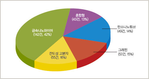 소재별 특허출원 비중을 보면, 금속 나노와이어가 41.6%, 전도성 고분자가 16.1%, 그래핀이 15.2%, 탄소나노튜브가 14.4%로 나타났고, 둘 이상의 대체소재들을 혼합해 전극을 제조한 혼합형은 12.6%였다. 금속나노와이어는 저비용으로 제조 가능하고 터치패널용 투명전극 필름이 요구하는 일정 수준 이상의 광투과도나 전도도를 비교적 쉽게 구현할 수 있어 타 소재들에 비해 높은 출원 비중을 보였다.