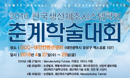 한국생산제조시스템학회는 오는 4월 27일부터 29일까지 대전에 위치한 DCC(대전컨벤션센터)에서 국내외 대학, 연구소, 산업체 연구자들을 초청하여 ‘2016 춘계학술대회’ 및 ‘제5회 생산제조기술혁신대회’를 개최한다. 이번 2016년도 춘계학술대회는 국내 생산제조기술의 발전을 통한 제조업 경쟁력 확보를 위해 산학연관이 혼연일체가 되어 소통을 하면서 친밀한 교류의 장이 되도록 봄 축제의 한마당을 준비할 예정이다.