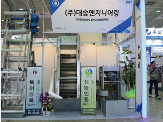 계단식 스크린, 파워링크 제진기, 유압 제진기, 로터리식 제진기, 협잡물 분리기 등을 생산하는 대승엔지니어링은 수처리 관련 전문 제조업체로서 국제환경산업기술 & 그린에너지전에 참가해 최첨단 제품들을 소개했다. 이날 전시장에서 선보인 제품들 중 파워 링크 제진기는 하수 및 폐수 처리장 초기 우수, 배수펌프장의 유입수로에 설치해 하수 속의 협잡물을 제거하기 위한 설비로서 바 스크린과 링크 체인, 레이크(Rake), 프레임, 구동장치 등으로 구성되어 있다.
