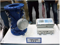 또한 이날 관람객들의 이목을 집중시킨 초음파 다회선 유량계는 관로에 설치된 상류 측 변환기와 하류 측 변환기가 서로 주고받은 초음파의 시간차를 구해 배관 내 다측정선상의 유속 V를 측정, 유량을 산출하는 고정밀 유량계로서 직관부 유지가 어려운 현장에서 측정 오차를 최소로 줄여 준다.