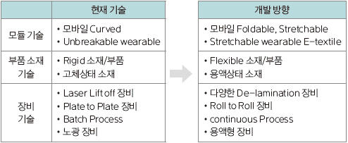 경박단소 및 유연화를 특징으로 하는 플렉서블 디스플레이를 구현하기 위해, ▲ 기판 기술 ▲ 구동소자 기술 ▲ 표시소자 기술 ▲ 봉지 기술 ▲ 탈착 기술 분야에서 기존 디스플레이 구현 기술과는 다른 개념의 소재, 공정 및 장비 기술 개발이 필요하다.