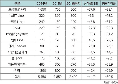 작년 설비 시장은 전년 대비 44.7% 감소한 2,850억 원 규모였으며, 도금/표면처리 공정용 설비는 57.6% 감소한 700억 원으로 집계됐다(표 5).