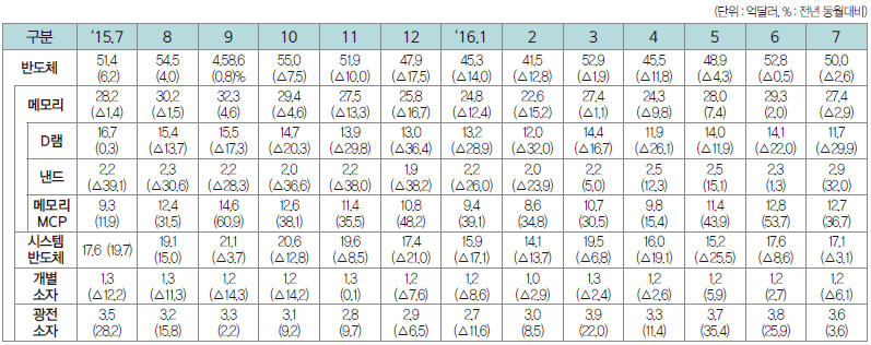 산업통상자원부는 올해 7월 정보통신기술(ICT) 분야의 수출이 반도체와 휴대전화, 디스플레이 등 3대 주력 업종의 부진으로 130억 2,000만 달러를 기록, 작년 동월 대비 6.6% 줄었다고 밝혔다. 반도체는 메모리 및 시스템 반도체의 수출 부진으로 50억 달러를 수출해 지난해 7월보다 2.6%가 감소했다. 수출 감소세가 지속되고 있으나, 다행히도 낸드 및 메모리 멀티칩 패키지(MCP)는 증가세에 있고, 시스템 반도체는 감소세가 완화되고 있는 것으로 나타났다.