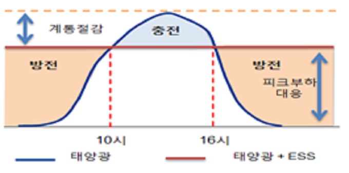 태양광에 설치하는 ESS는 일조량이 좋은 낮에 생산된 전기를 충전하고 저녁 시간에 방전을 유도하여, 낮에 최대발전으로 생기는 전력망 접속용량 부족을 완화하고, 봄‧가을‧겨울의 밤에 생기는 높은 전기수요에 대응하는 효과를 거둘 것으로 기대된다.