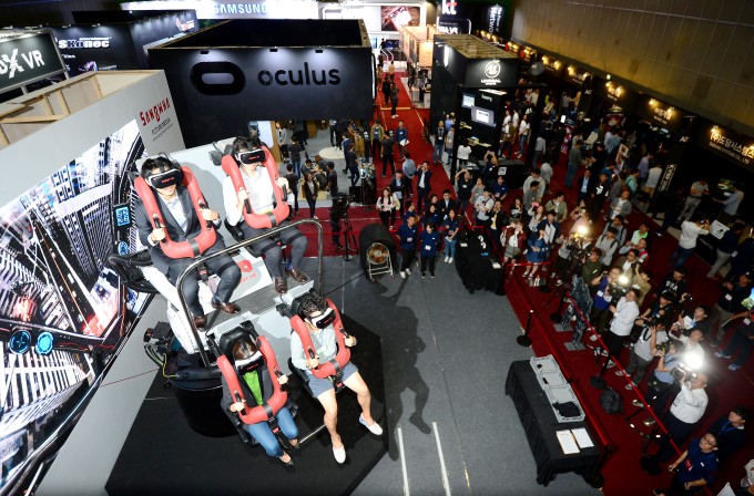 ▲6일 오전 서울 마포구 상암동 누리꿈 스퀘어 공동제작센터에서 열린 '코리아 VR 페스티벌'에서 관람객들이 국내 기업 상화가 개발한 로봇VR 콘텐츠를 즐기고 있다. 코리아 VR 페스티벌은 오는 9일까지 상암동 누리꿈 스퀘어에서 계속된다. 2016.10.6/뉴스1 © News1 박정호 기자