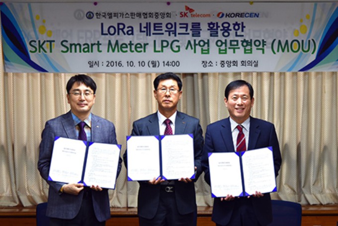 이날 SK텔레콤은 한국LP가스판매협회중앙회 및 코리센과 IoT전용망인 로라(LoRa) 네트워크를 기반으로 LP가스 안전관리 솔루션 '스마트미터LPG'를 적용하는 양해각서를 체결했다.