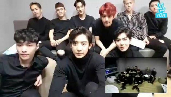 브이 라이브(V LIVE)의 듀얼라이브기능을 사용해 방송중인 엑소(EX0) [사진=네이버]
