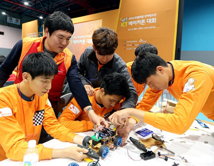 ▲'2016 SKT 장애청소년 ICT 메이커톤 대회'에서 참가한 장애청소년들이 그간 갈고 닦은 ICT 기량을 모아 직접 스마트카를 만들어보고 있다