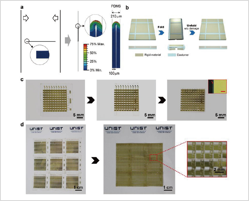 이 같은 폴더블 기판과 신축성 전극을 이용해 폴더블 디스플레이의 응용 분야 중 하나인 무베젤(zero-bezel) 디스플레이용 backplane과 이를 통한 seamlesss 타일형 디스플레이용 backplane을 제작했다(그림 2c). 디스플레이의 베젤 부분을 뒤로 접어 넘김으로써 무베젤 디스플레이용 backplane을 제작할 수 있었으며, 이러한 무베젤 디스플레이 여럿을 묶어 seamless 타일형 디스플레이용 backplane을 제작했다(그림 2d). 이러한 방식으로 제작된 디스플레이용 backplane의 전기적 특성은 폴더블 기판과 신축성 전극의 기계적 우수성 덕분에 유지가 가능하다.