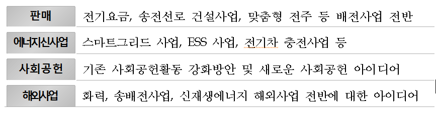 전기를 사용하는 국민이면 누구나 한전 크라우드 시스템에 접속하여 참여가 가능하며, 공모 분야는 아래와 같다.