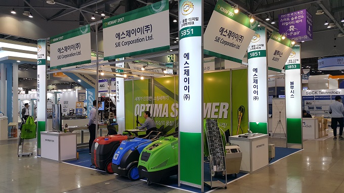 한국기계전에 참가한 에스제이이는 스팀 세척기, 옵티마 스티머의 신제품인 OPTIMA XD를 선보였다.
