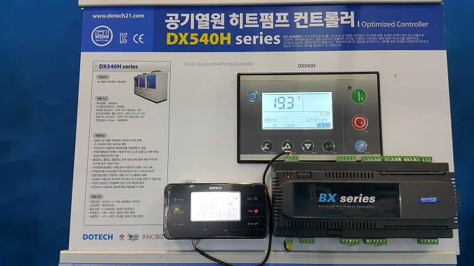 그리고 두텍은 공기열원 히트펌프 컨트롤러(DX540H 시리즈)도 선보였는데, 이 컨트롤러는 마이크로프로세서 기반의 공기열원 히트펌프 시스템에 맞춤 설계된 최적의 제어 알고리즘으로 되어 있다. 냉매 압축기의 효율적인 운전을 수행하고, 히트펌프 냉매 압축기 운전을 집중적으로 관리하며 용량조정 타이밍을 판단 및 제어해 에너지 절감을 도모한다. 또한 경보를 울려 발생을 미연에 방지하거나 필요한 유지보수 정보를 알려준다.
