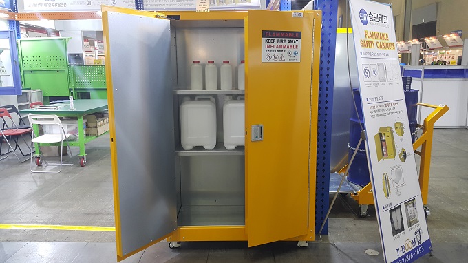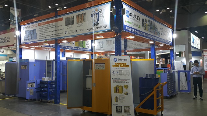 승민테크는 한국기계전에 참가해 다양한 보관함, 이동 공구함, 캐비닛 등을 선보였다. 승민테크의 부식성 보관함의 경우 MSDS에 부식성으로 분류된 제품을 보관할 수 있고, 화학저항성 코팅이 되어 있어 인화성 및 부식성 물질 보관에 적합하다. 이 보관함은 700℃ 이상의 온도로 10분간 가열했을 때 캐비닛 내부 온도가 163℃ 이하로 유지되는 성능을 갖추고 있다.