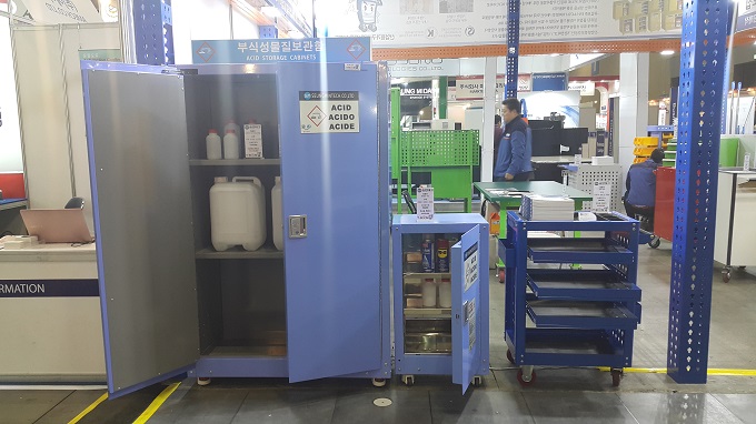 이 부식성 보관함은 외부 배기장치를 연결해 내부의 가스 등을 배출할 수 있으며, 통풍구 두 군데를 부착해 자연환기를 할 수도 있다. 아래쪽에 외부 흐름방지턱이 부착되어 있어 내부의 액체성 화학물질 유출을 차단한다. 이 제품은 산업안전보건공단의 S안전마크와 산업기술시험원의 K마크를 획득했다.