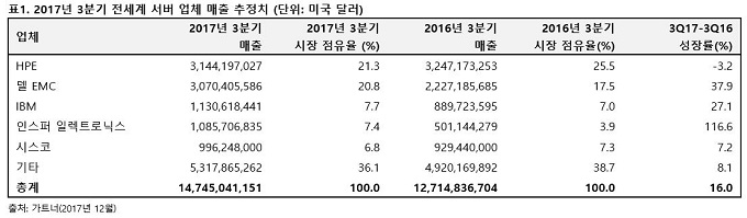 휴렛패커드 엔터프라이즈(HPE)는 매출 기준으로 전세계 서버 시장에서 선두를 차지했다. 2017년 3분기 전년 동기 대비 성장률은 3.2% 감소했으나, 약 31억 달러의 매출, 21%의 시장 점유율로 1위를 고수했다(표1 참조). 델(Dell) EMC는 전년 동기 대비 37.9%의 성장률, 시장 점유율 20.8%로 2위를 차지했다.