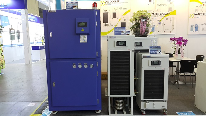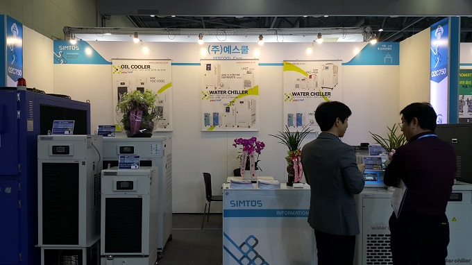 워터 칠러, 오일 쿨러 등의 냉각기 전문 기업인 예스쿨은 SIMTOS 2018에 참가해 다양한 분야에서 사용되는 냉각기를 선보였다. 그중 수냉식 일체형 냉각기인 YRC-1W∼40W 모델(Water Chiller)은 냉각탑이나 지하수 등의 물을 이용한 응축냉각 방식으로 실내의 소음을 최소화하고 캐스터가 장착되어 이동이 편리하다. 또한 공랭식보다 높은 냉각 효율을 보이며, 온도 제어가 가능해 사용온도 범위를 폭넓게 조정하고 정밀온도 유지로 제품의 불량률을 줄인다.
