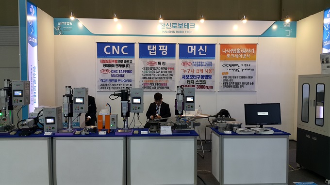 SIMTOS 2018에 참가한 한신로보테크는 참관객들에게 나사(탭홀) 검사 기능을 갖춘 CNC 탭핑 머신을 선보였다. 이 제품은 서보 모터(스핀들+상하 이송) 구동으로 정밀 제어가 가능하고 터치스크린 방식으로 되어 있어 조작이 간편하다. 또한 탭 피치 기어 교환이 필요 없고 마이크로 소형 탭 작업에 적합하다.