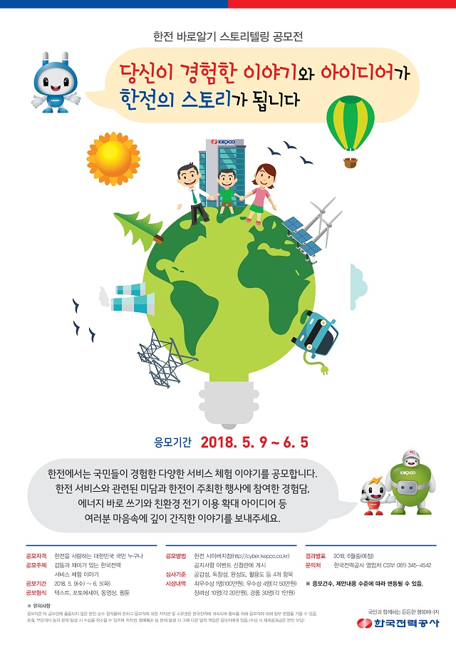 한국전력은 고객과의 소통 활성화와 전력사업의 이해도를 높이기 위해 전 국민이 참여하는 ‘한전 바로알기 스토리텔링 공모전’을 개최한다.