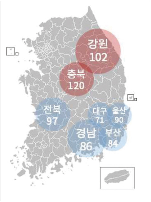 전국 BSI 지수는 충북(120), 광주(119), 전남(113), 강원(102), 경기(102), 대전(101), 제주(100) 등은 기준치(100) 이상이었고 인천(98), 충남(97), 전북(97), 경북(96), 서울(95), 울산(90), 경남(86), 부산(84), 대구(71) 등은 기준치 미만이었다.