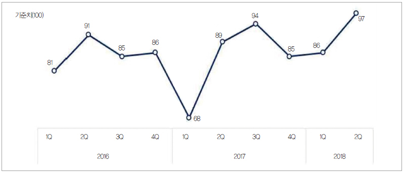 반면, 철강(84), 자동차(88), 조선업종(66) 전망은 어두웠다. 철강은 미국의 수입쿼터로, 자동차는 완성차 업체들의 실적저하, 군산 GM 공장 폐쇄결정 등으로 인근지역의 완성차·부품업체들이 어려움을 겪는 것으로 나타났다. 조선 역시 현대중공업 군산조선소 가동중단 등으로 조선벨트(군산, 울산 등)가 여전히 어려운 상황이다.