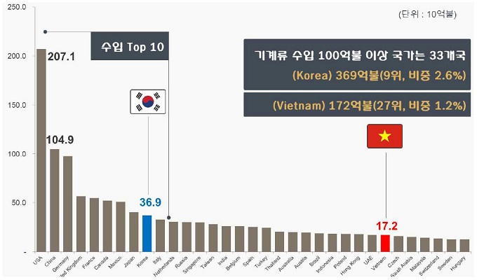 한편 베트남은 2016년 기준 172억 달러의 기계류를 수입한 국가로, 수입 규모로 보면 세계 27위다. 특히 한국에게는 세 번째로 기계류 수출을 많이 하는 수출 효자 국가이다. 한국은 2017년 기준, 베트남에 49.6억 달러를 수출했다.