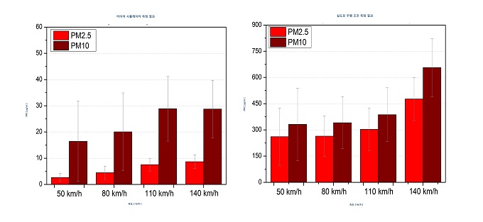 ▲타이어 마모 시뮬레이터로 측정한 미세먼지 배출량(왼쪽)과 실제 도로 주행 조건에서 측정한 미세먼지 배출량(오른쪽)을 나타낸 그래프. 이 그래프를 통해 순수하게 타이어 마모로 발생한 미세먼지의 양을 파악할 수 있다.
