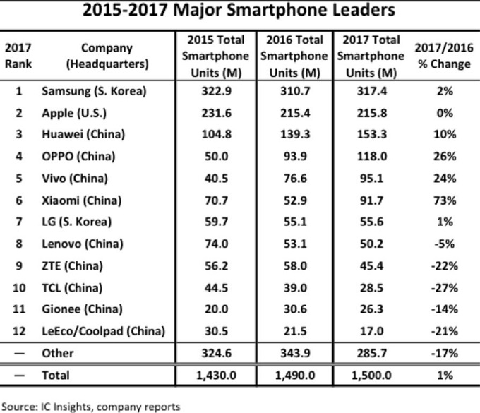 IC Insights에 따르면, 2017년의 스마트폰 출하량은 2016년의 14억 9000만대에 비해 1% 증가한 15억 대를 기록했다. 2019년에는 15억 3000만대, 2021년까지 한 자리수 대의 낮은 성장률로 성장을 계속할 것으로 IC Insights는 예측하고 있다.