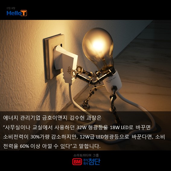 5. 에너지 관리기업 금호이앤지 김수현 과장은 “사무실이나 교실에서 사용하던 32W 형광등을 18W LED로 바꾸면 소비전력이 30%가량 감소하지만, 12W급 LED형광등으로 바꾼다면, 소비 전력을 60% 이상 아낄 수 있다”고 말합니다.