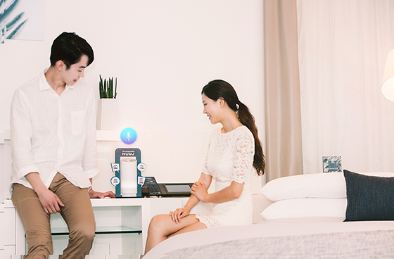 비스타 워커힐 서울의 객실에 설치된 ‘누구’를 통해 고객들은 객실의 조명, 커튼, 온도설정 및 게스트 서비스 설정 등을 음성으로 쉽게 제어하게 되며, 입실할 때는 AI가 들려주는 웰컴 음악을 듣게 된다.