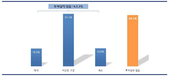 우선, 올해 1~9월 기간 중 투자실적이 있었던 기업은 63.3%(전년 동기간 대비 ‘비슷한 수준’ 37.7%+‘축소’ 13.0%+‘확대’ 12.6%), 투자실적이 없었던 기업은 36.7%인 것으로 조사되었다.