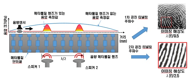 한국기계연구원 나노자연모사연구실 허신 책임연구원 연구팀은 특정 주파수를 갖는 두 음원을 메타렌즈에 통과시켜 회절한계*의 4배까지 이미징하는 데 성공했다. 물체의 형상정보를 전달하는 소멸파는 거리에 따라 급격히 사라지지만 메타렌즈에 통과시키면 내부에 공진터널링* 현상이 발생하면서 소멸되지 않고 이미징 할 수 있다.