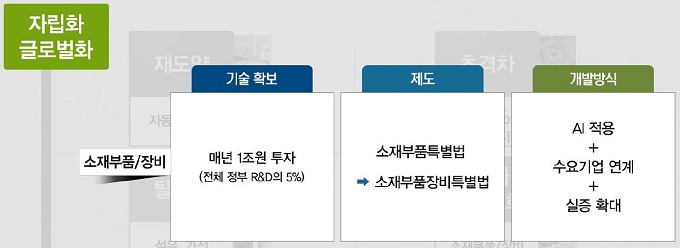소재·부품·장비: 2001년 소재·부품 특별법 제정 등 그간의 정책노력에도 불구하고 핵심 소재·부품과 장비의 대외 경쟁력이 아직 낮아, 대대적인 투자와 개발방식의 전환으로 자립화를 넘어 글로벌화를 추진한다. 세부 내용으로 ▲ 소재·부품·장비 R&D에 매년 1조원 규모로 대대적 투자 ▲ 소재·부품 특별법을 소재·부품·장비 특별법으로 개정 ▲ 인공지능 활용, 실증기반 구축으로 개발기간 단축 및 사업화율 제고 등이 포함돼 있다.