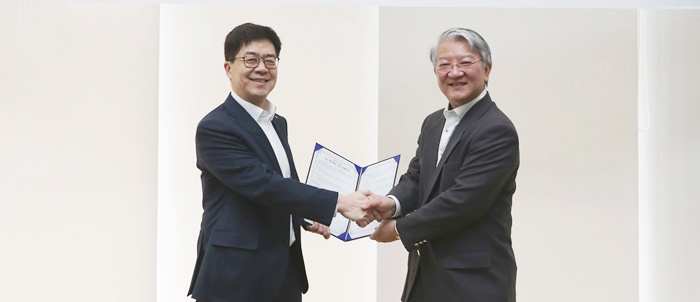 ▲ LG전자 CTO 박일평 사장(왼쪽)과 이상엽 KI연구원장이 악수를 하고 있다.